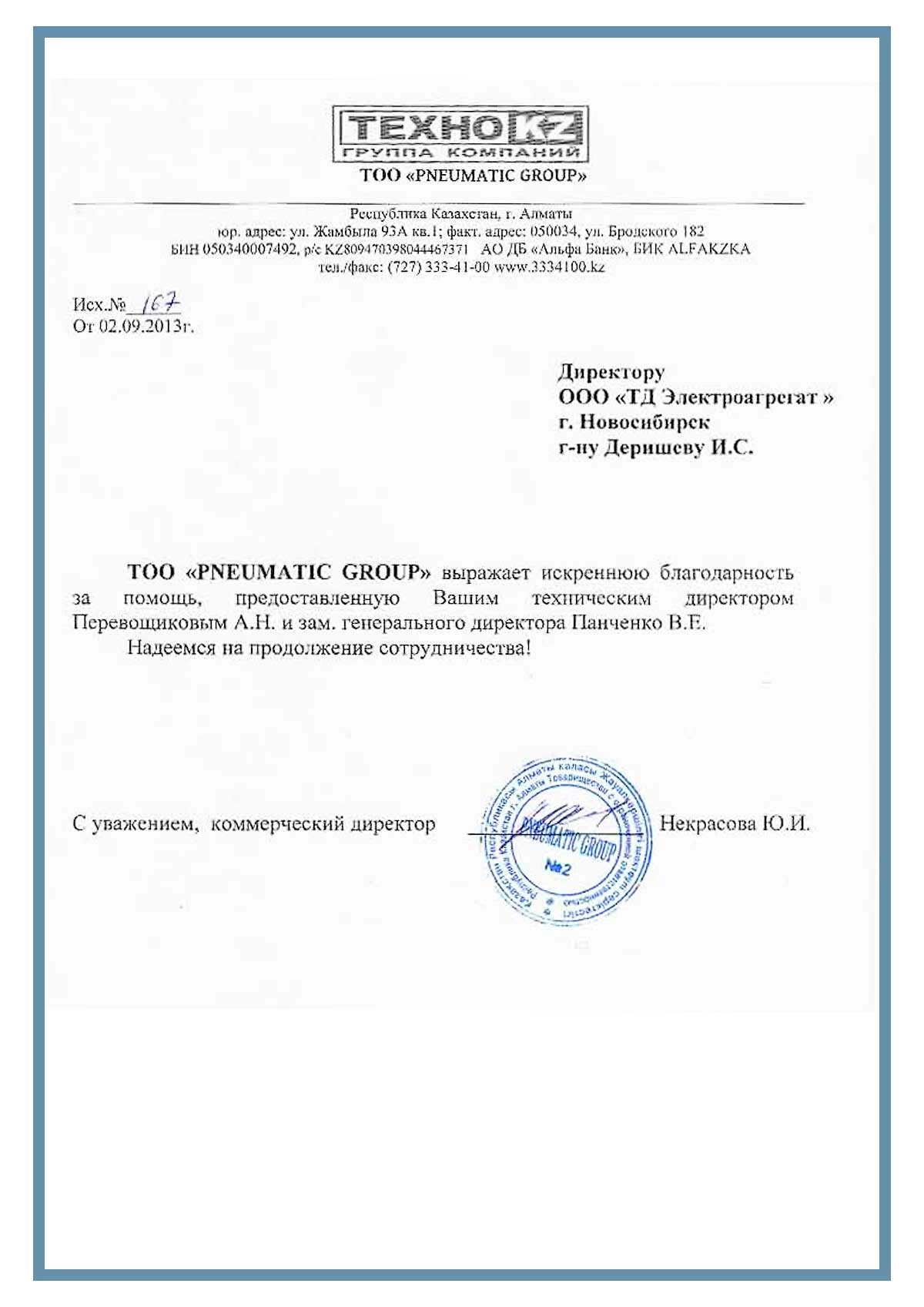 [ALT] => Отзыв контрагентов о компании ООО «ТД Электроагрегат» и исполненном проекте для ТОО "PNEUMATIC GROUP" г. Алматы, Республика Казахстан